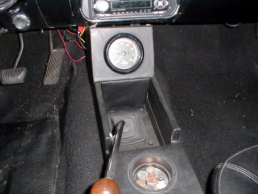 Ahhh, down to business. Wondering what to do with the front, I came up with the idea of a tach. It looks really cool at night when its lit up. Again you can kind of see how it doesn't fit just right with the 4 speed. That open section used to be covered and a place for the auto shifter in the middle.