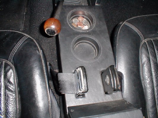 There are the cup holders and seatbelt holders. The cup holders were easy to get. We went to the store and bought some cheapo cup holders, then used a dremel to make them the right size. We did the seat belt holders because that is kinda like a '68 console. Also becasue there was no place for them.